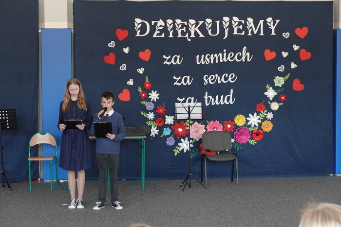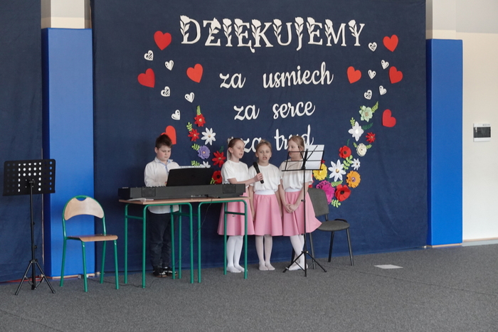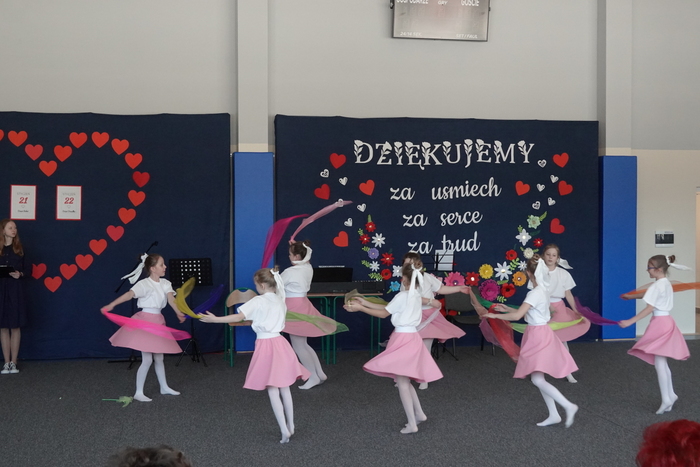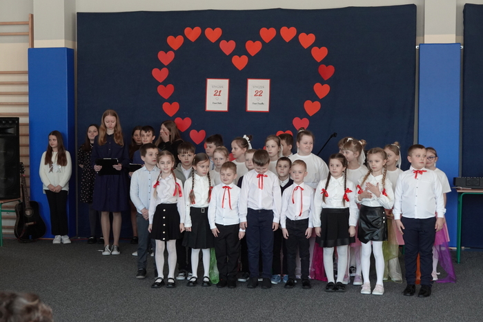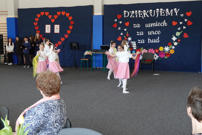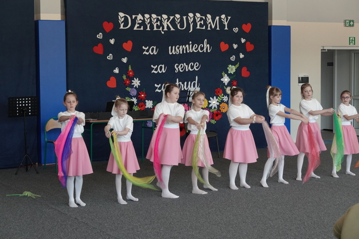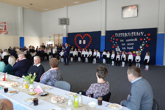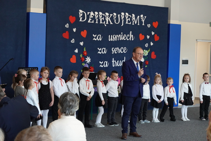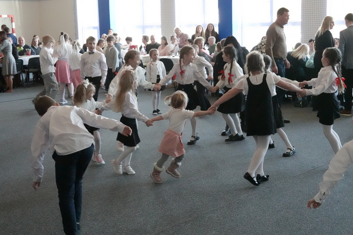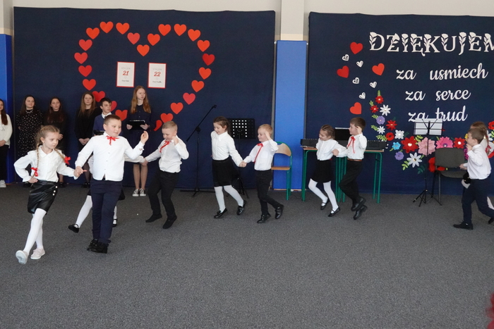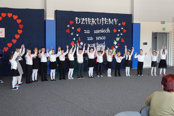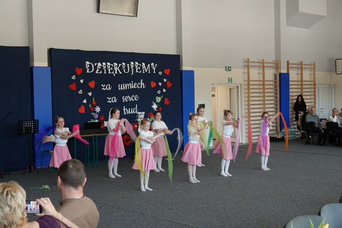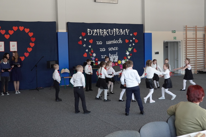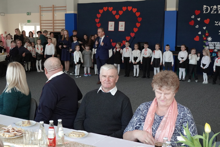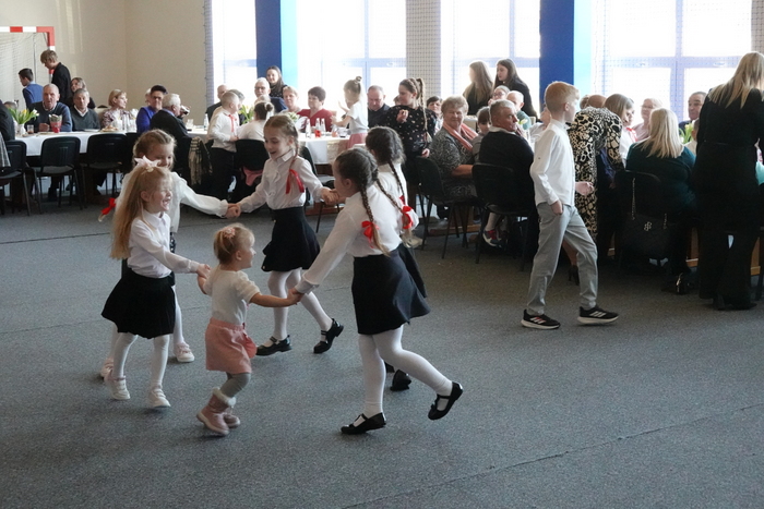 Uroczystość rozpoczęła się występem najmłodszych uczniów – tanecznym pokazem przedszkolaków, który spotkał się z ogromnym entuzjazmem publiczności. Następnie na scenie zaprezentowali się uczniowie klas I–III, wykonując piosenkę pt. „Babciu, Dziadku”.