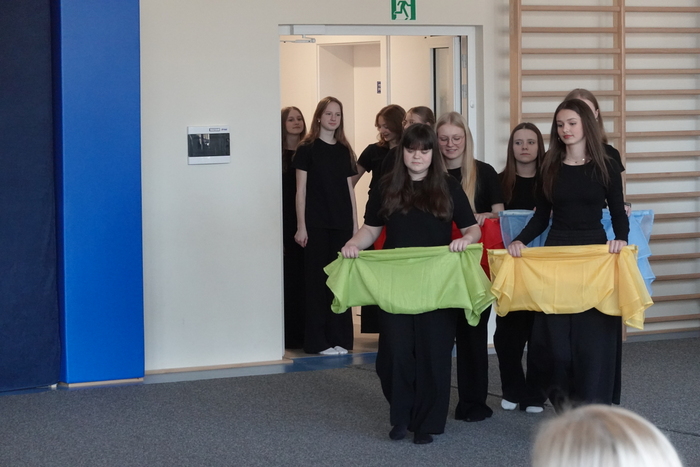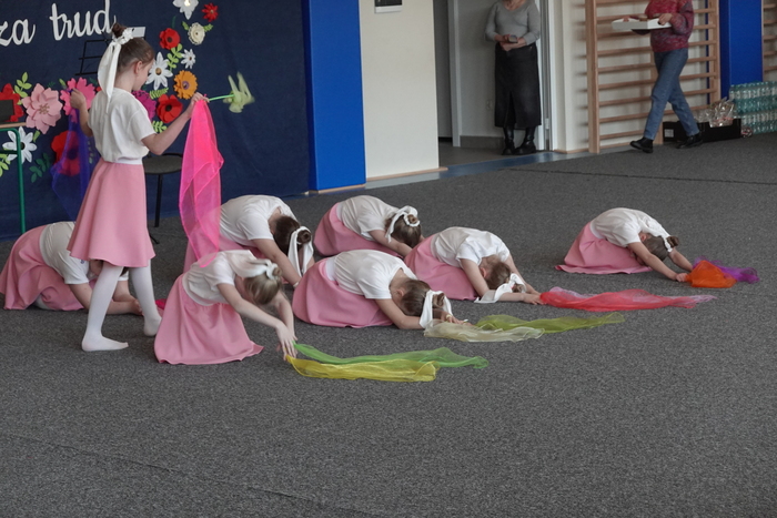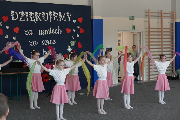 Kolejnym punktem programu był taniec krakowiak w wykonaniu uczniów klasy „0” oraz klasy I, który zachwycił widzów barwnymi strojami, energią i ludowym charakterem. Po nim wystąpiły dziewczynki z klas II–III, prezentując układ taneczny pełen gracji i wdzięku.