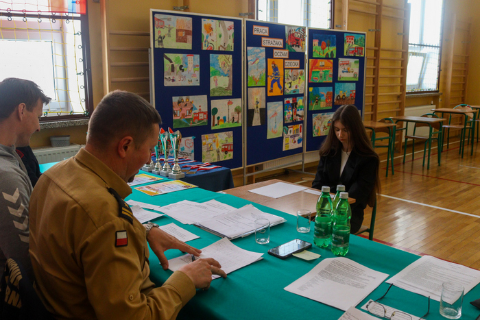 I grupa: uczniowie klas I – IV, II grupa: uczniowie klas V – VIII z terenu gminy. W pięknie udekorowanej sali plakatami o tematyce p-poż., sprzętem strażackim oraz umundurowaniem, młodzież rozwiązywała trudny test oraz egzamin ustny przygotowany przez PSP w Gorlicach