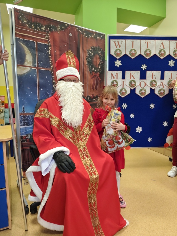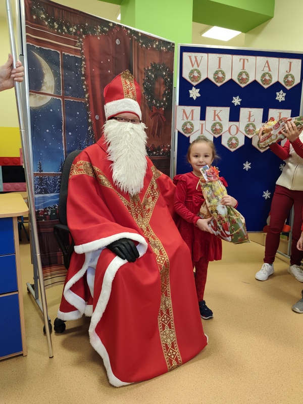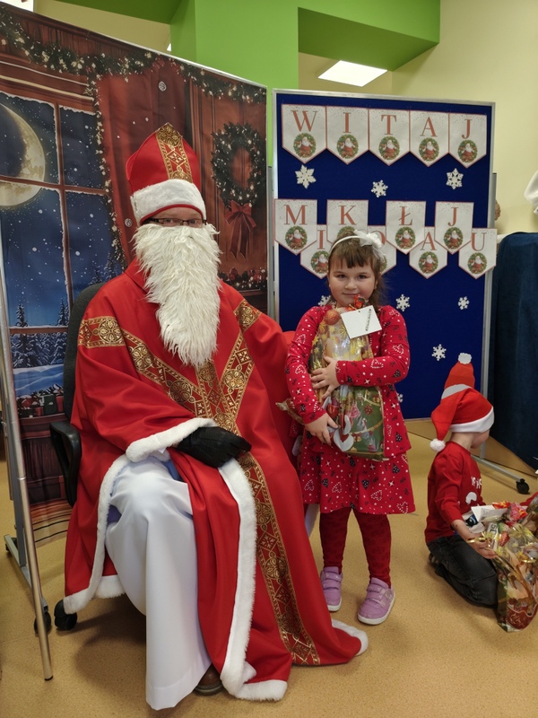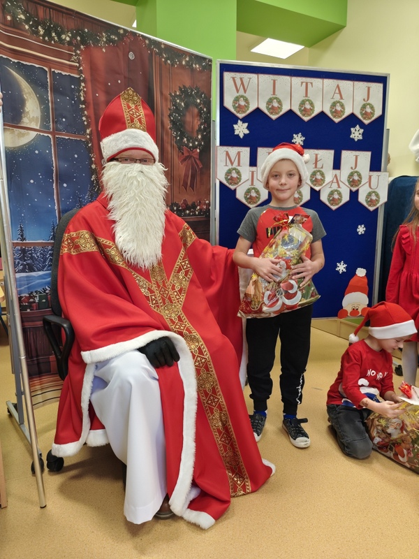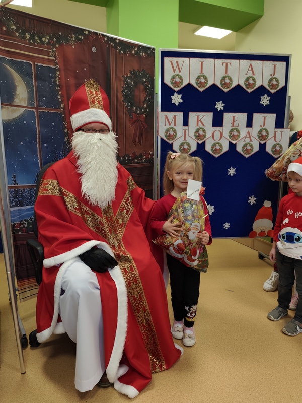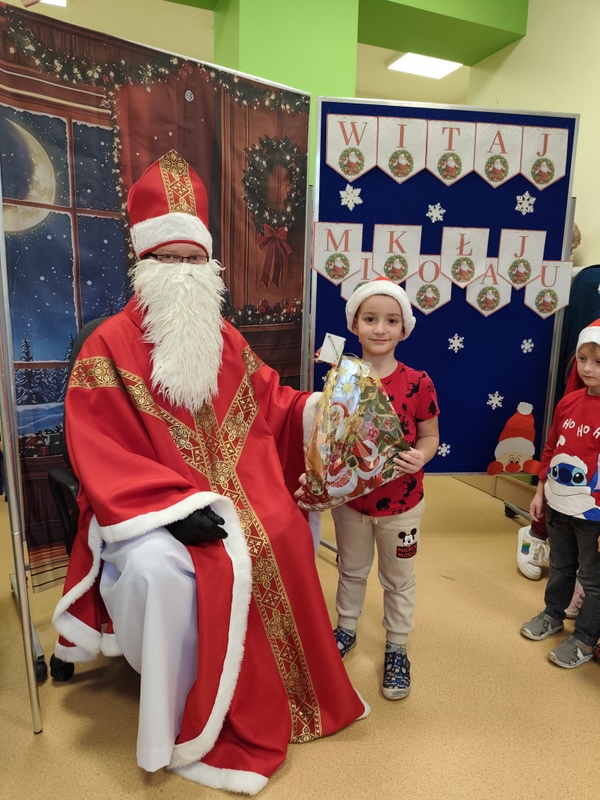 wszystkie dzieci. Dzieci z ogromną radością uczestniczyły w spotkaniu, zadając Mikołajowi pytania i dzieląc się swoimi świątecznymi marzeniami. W salach panowała ciepła, świąteczna atmosfera, a wspólne chwile dostarczyły dzieciom wiele radości i niezapomnianych wrażeń. Wizyta Świętego Mikołaja była dla najmłodszych wyjątkowym wydarzeniem, które wprowadziło wszystkich w magiczny klimat zbliżających się Świąt Bożego Narodzenia.