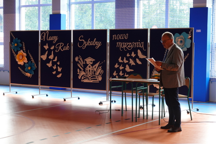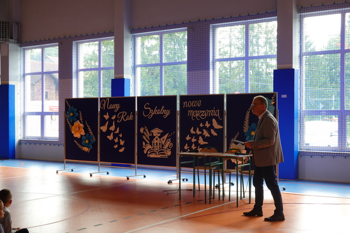 W dalszej części spotkania pan dyrektor Andrzej Płaziński powitał wszystkich obecnych: nauczycieli, księdza proboszcza, rodziców i uczniów. Przekazał również bardzo ważną informację, że nasza szkoła ma swojego patrona i od 1 września będzie nosiła imię: „Św. Jana Pawła II”. Główne uroczystości związane z tym wydarzeniem odbędą się 16 października.
